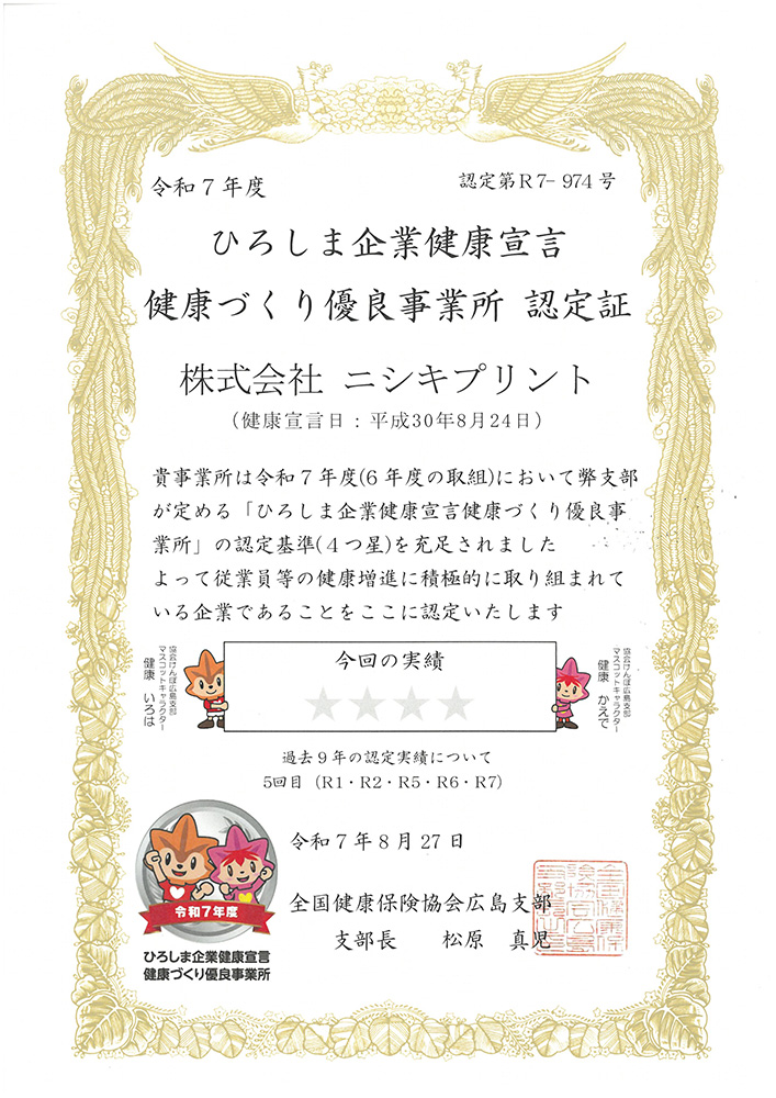 | 8月 | ひろしま企業健康宣言健康づくり優良事業所に認定 | ||