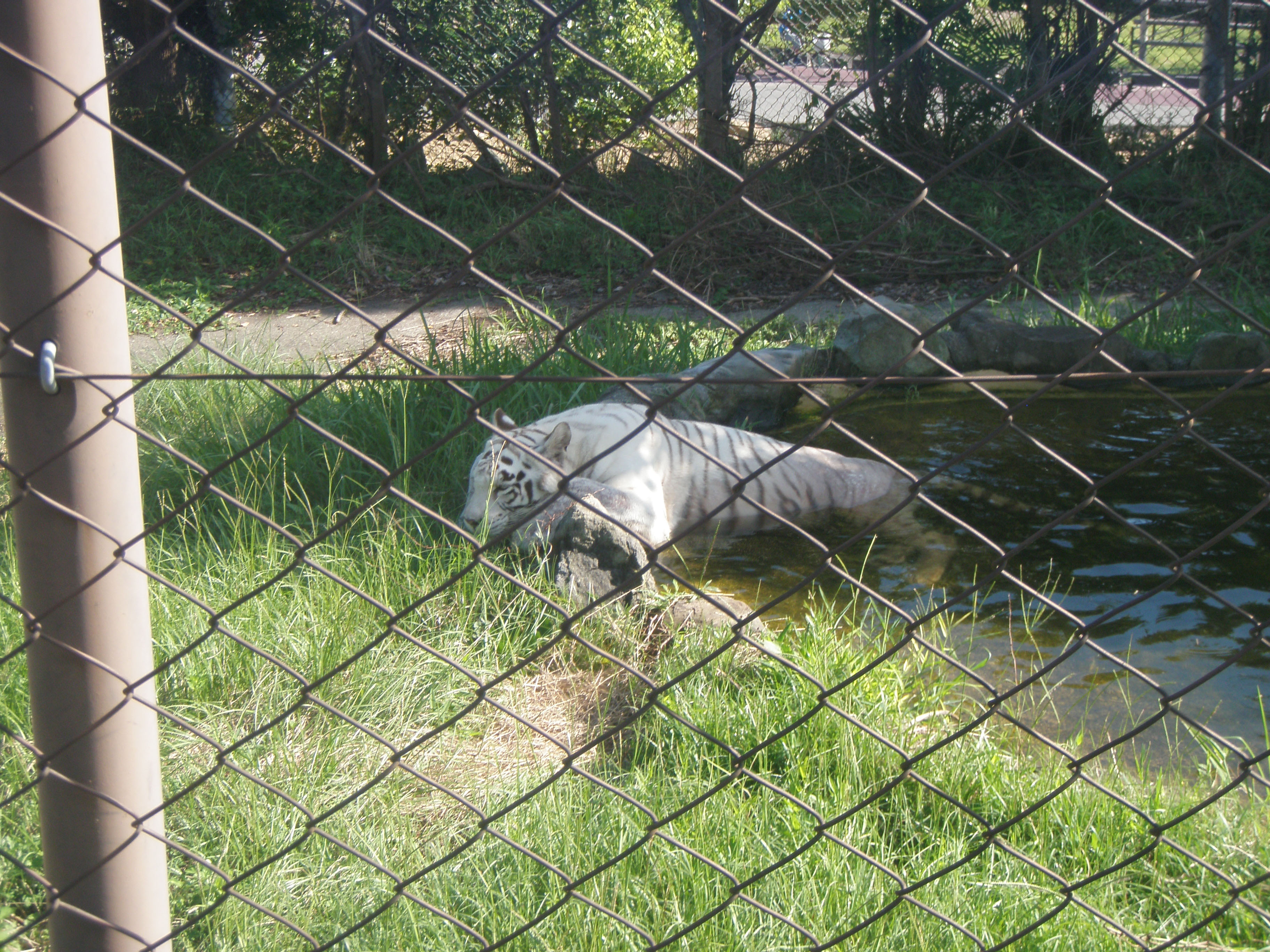 ホワイトタイガー。怖がりなので、下半身だけ水浴中。