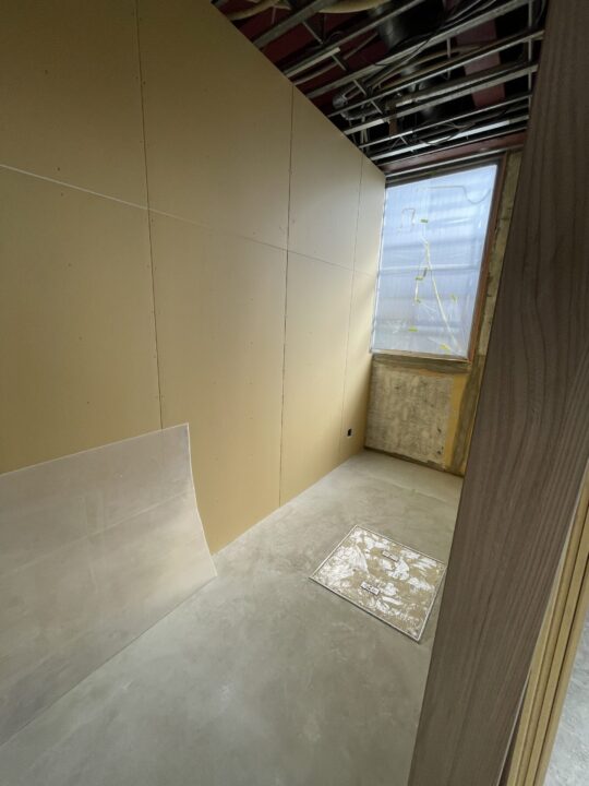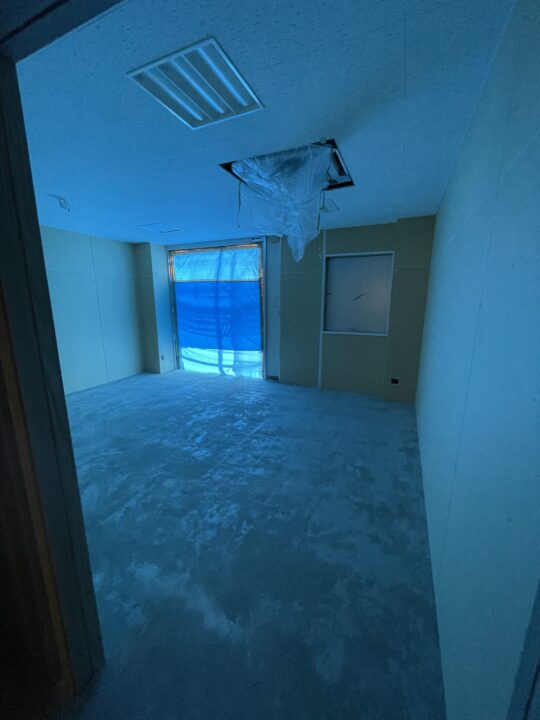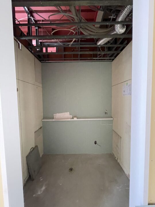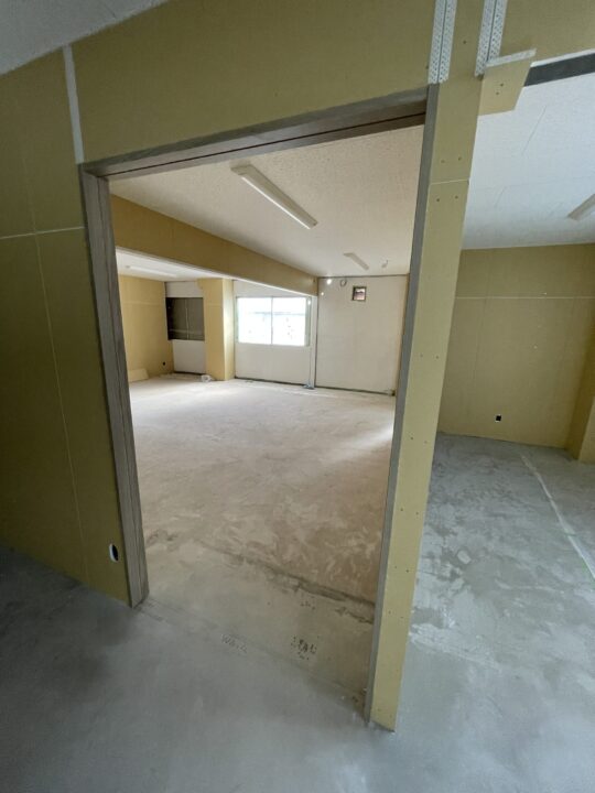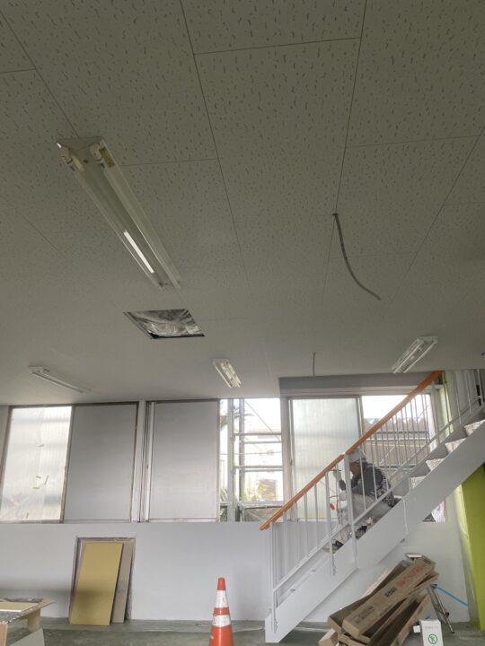 先日の内装工事では、まだ天井はむき出しで壁は檻のようになっていましたが、天井も壁もできてきました。